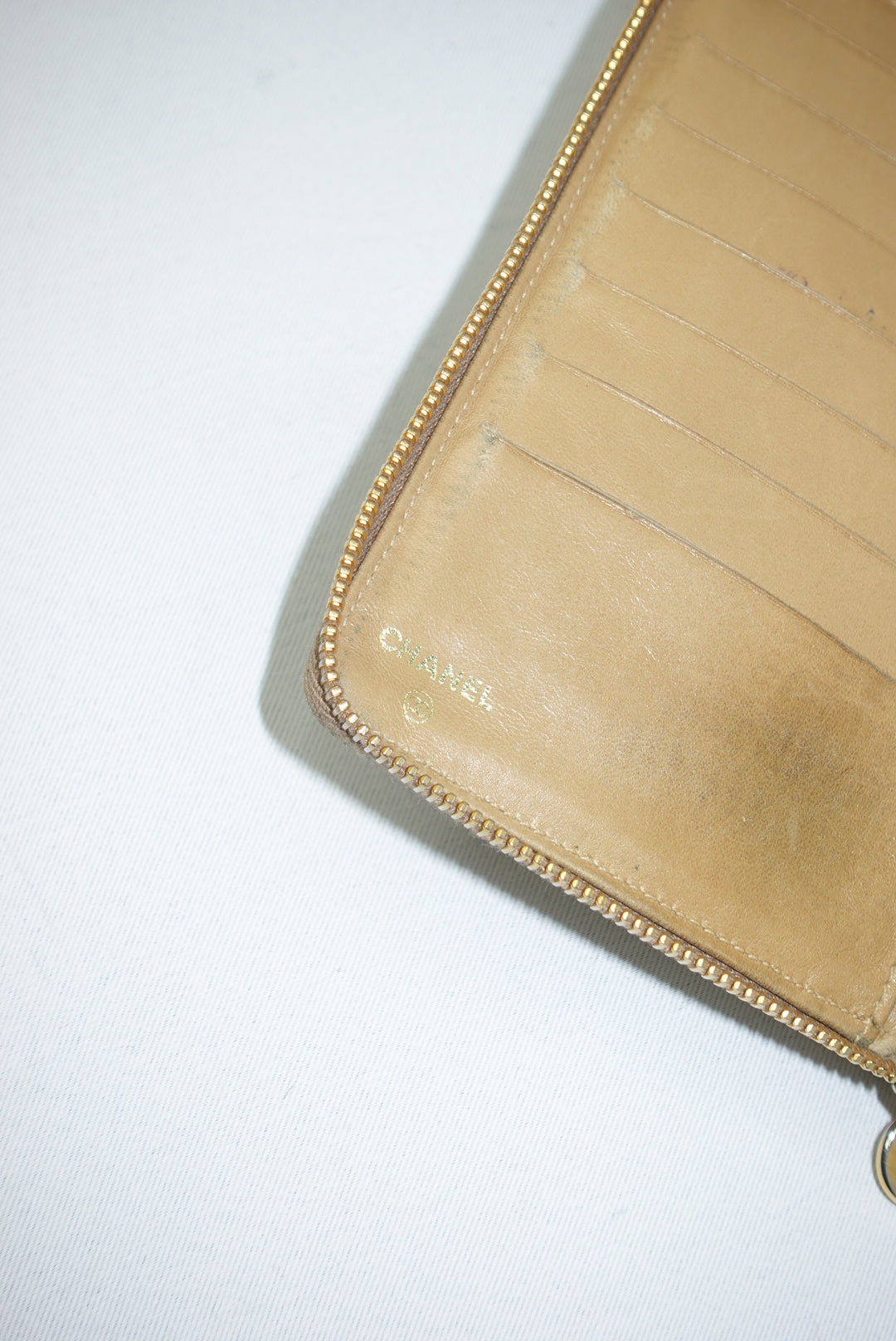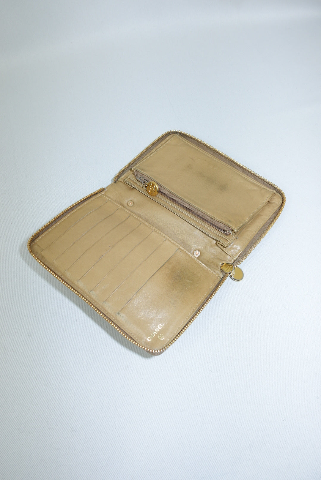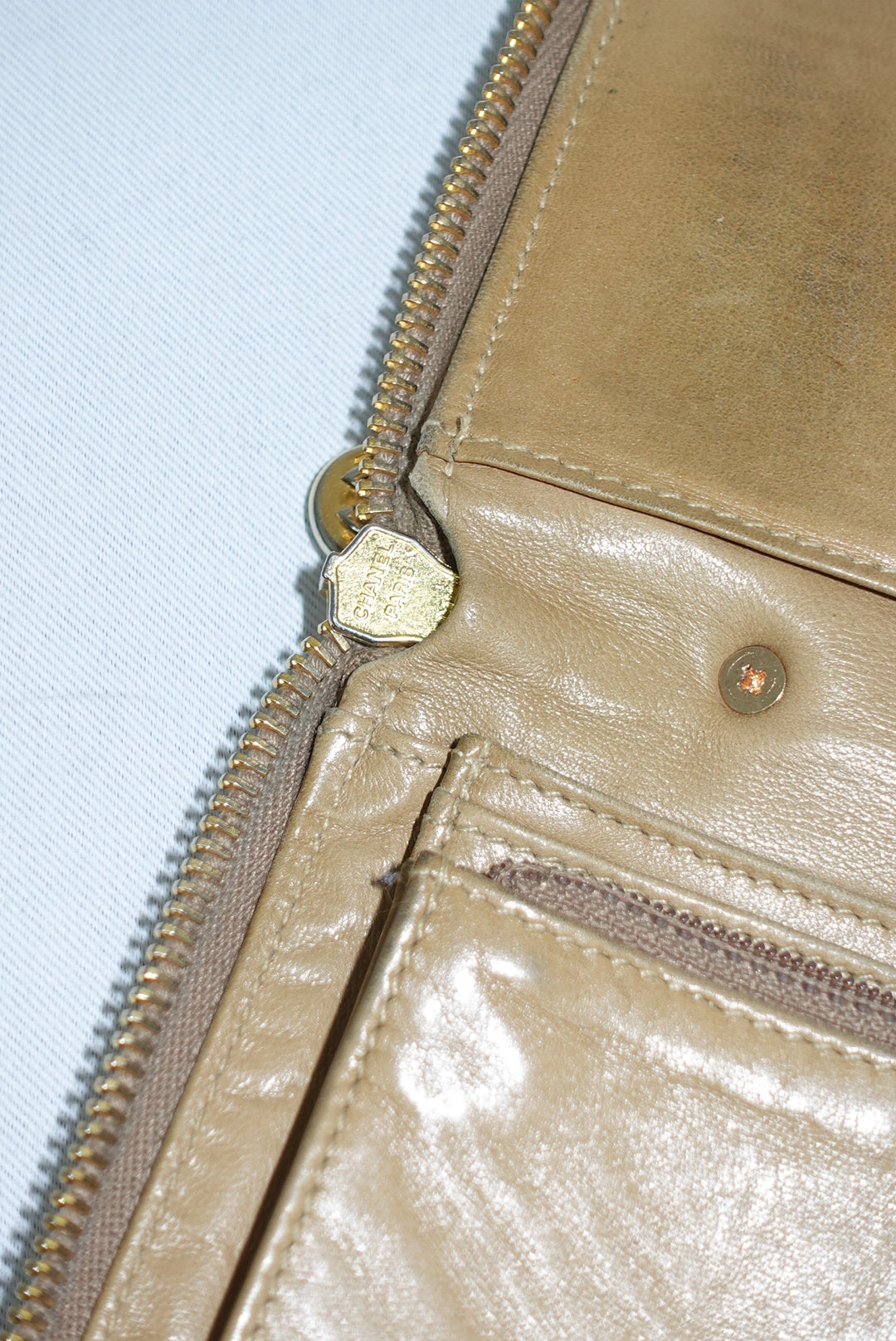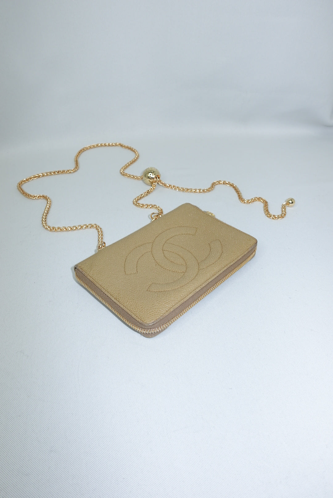 Portafoglio Chanel Vintage rielaborato medio con cerniera e catena in pelle caviale beige chiaro