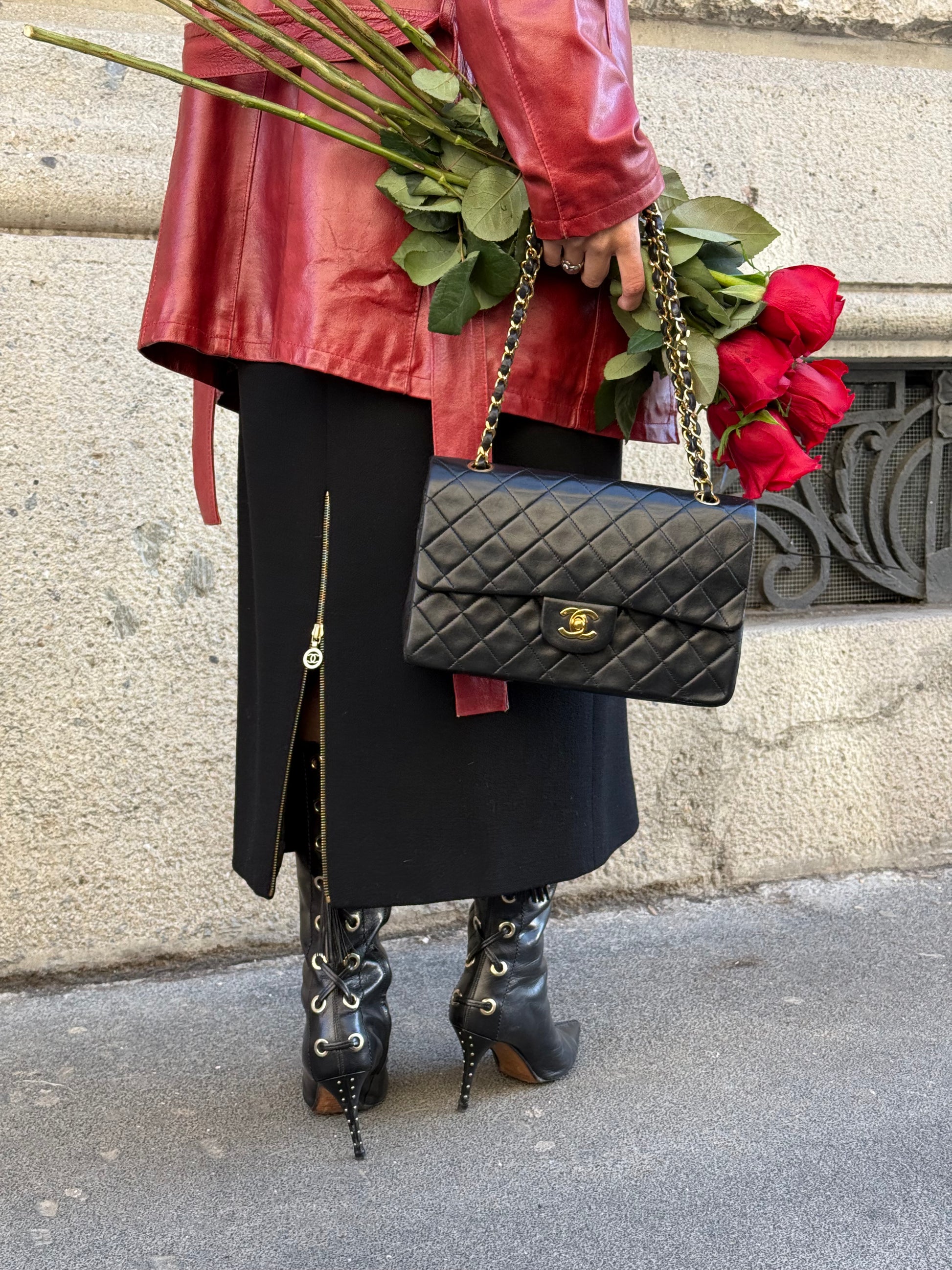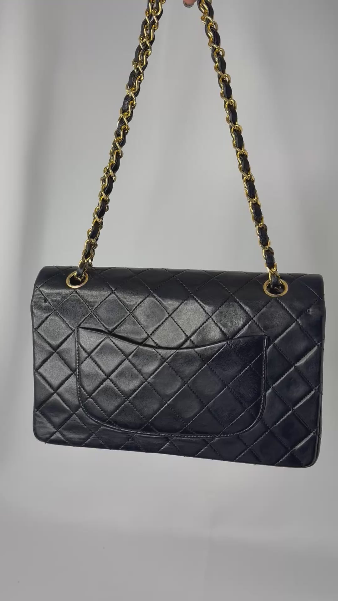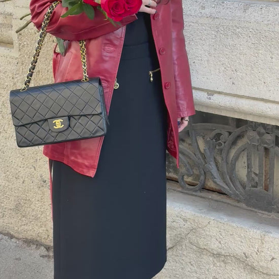 Chanel Vintage Classic Timeless 25 Double Flap in pelle di agnello nera con finiture dorate, una delle borse Chanel più iconiche e ricercate. Realizzata con l'iconico motivo trapuntato, la chiusura a girello con logo CC intrecciato e la tracolla a catena in pelle intrecciata, questa borsa offre un'eleganza senza tempo e una versatilità quotidiana. Un vero e proprio investimento, perfetto per collezionisti e amanti dello stile vintage Chanel.