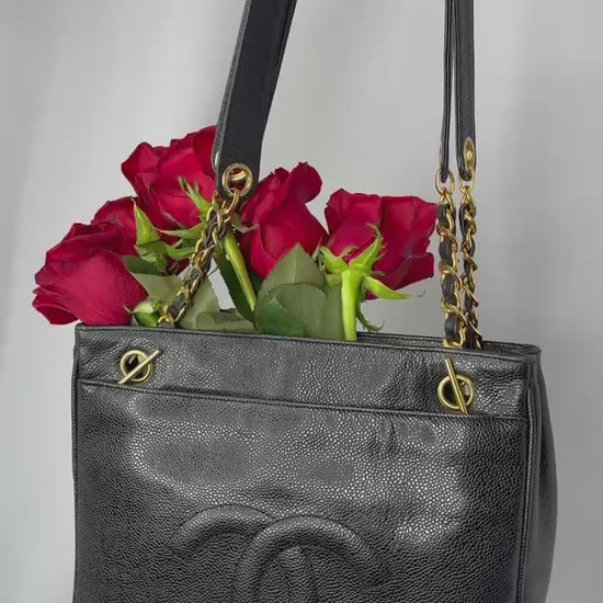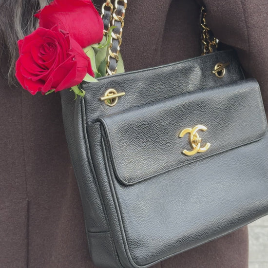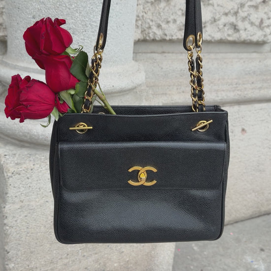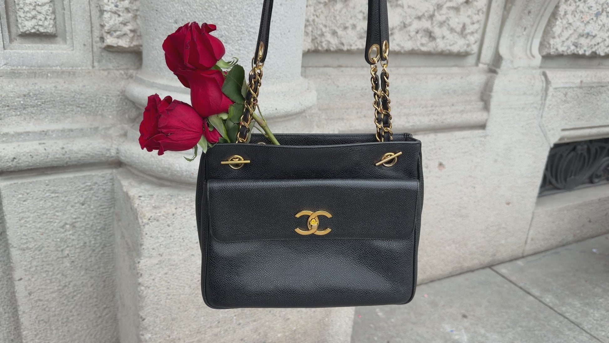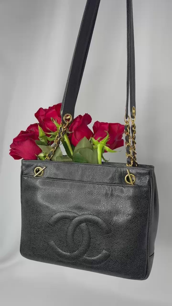 Questa borsa tote Chanel Vintage incarna l'eleganza senza tempo dell'epoca d'oro della Maison. Realizzata in pelle martellata nera e rifinita con finiture placcate oro 18 carati, la borsa riflette la raffinata artigianalità e i codici di design intramontabili che definiscono le creazioni Chanel della metà degli anni '90.