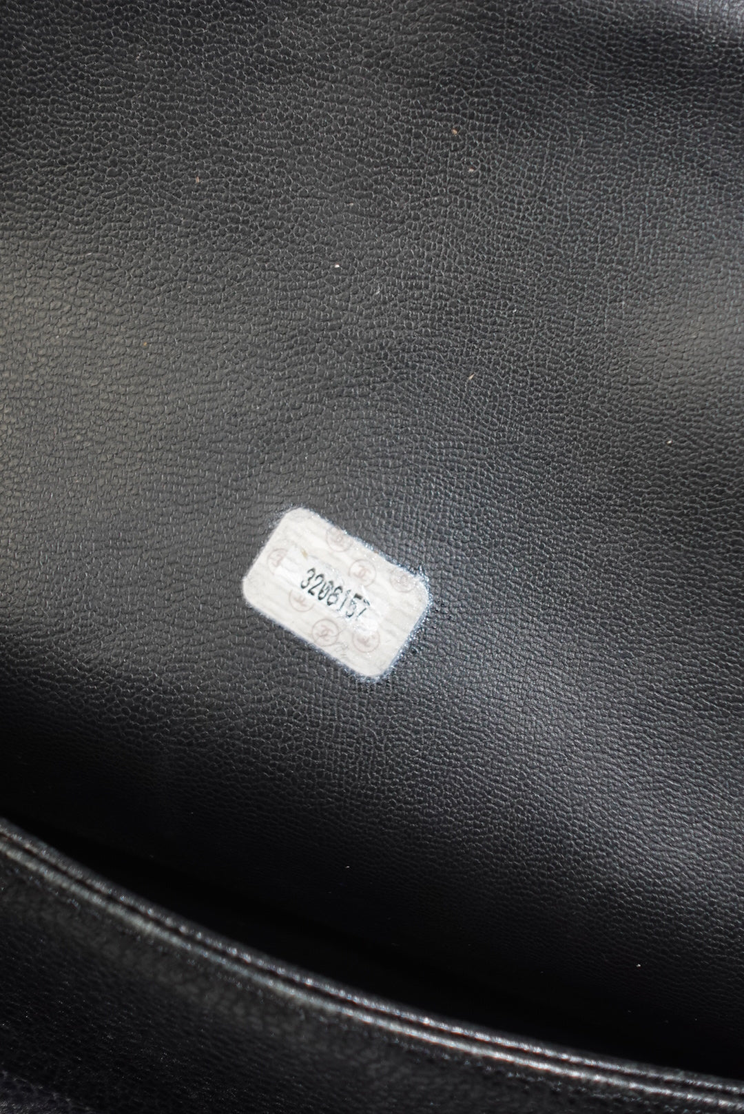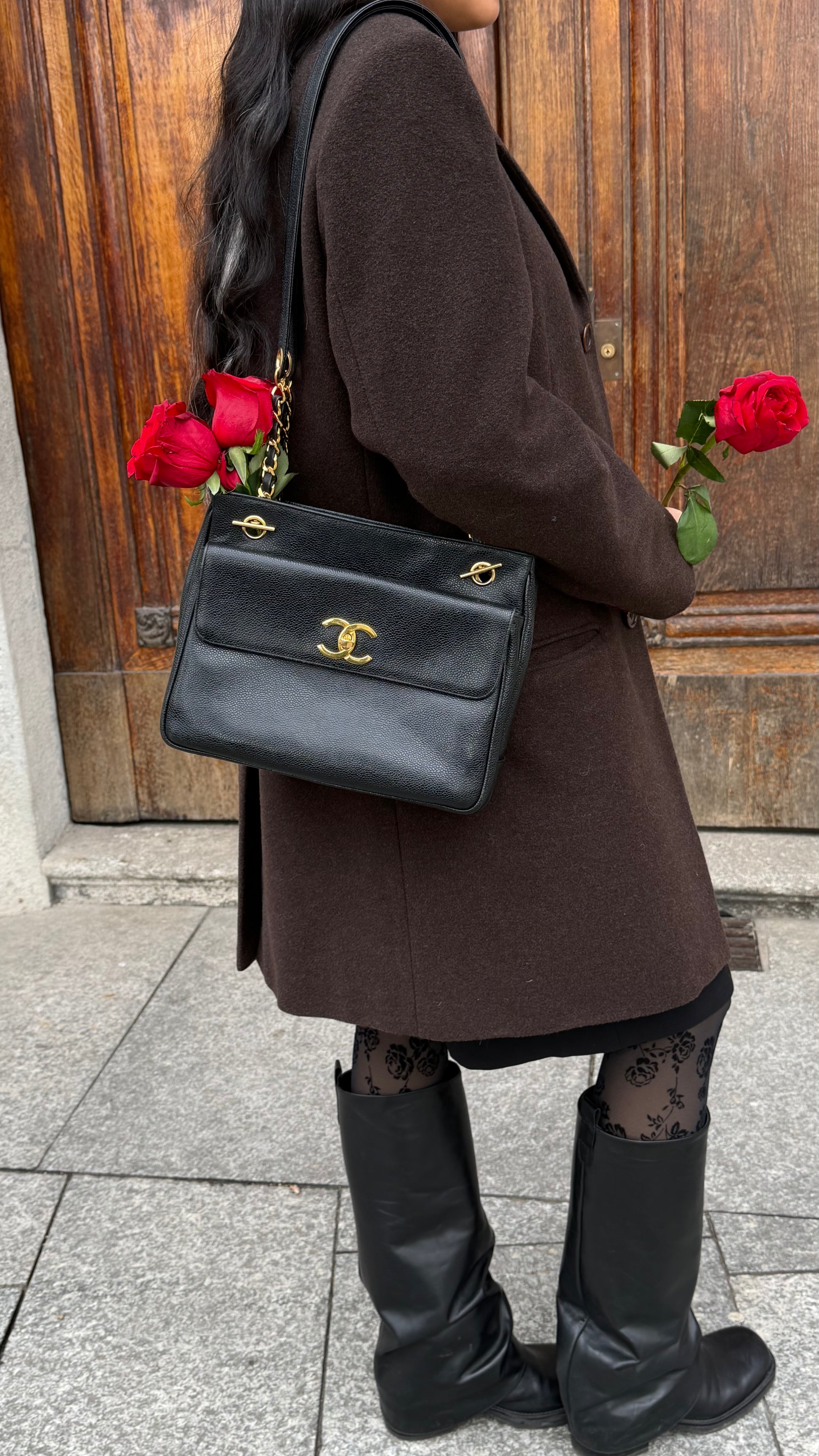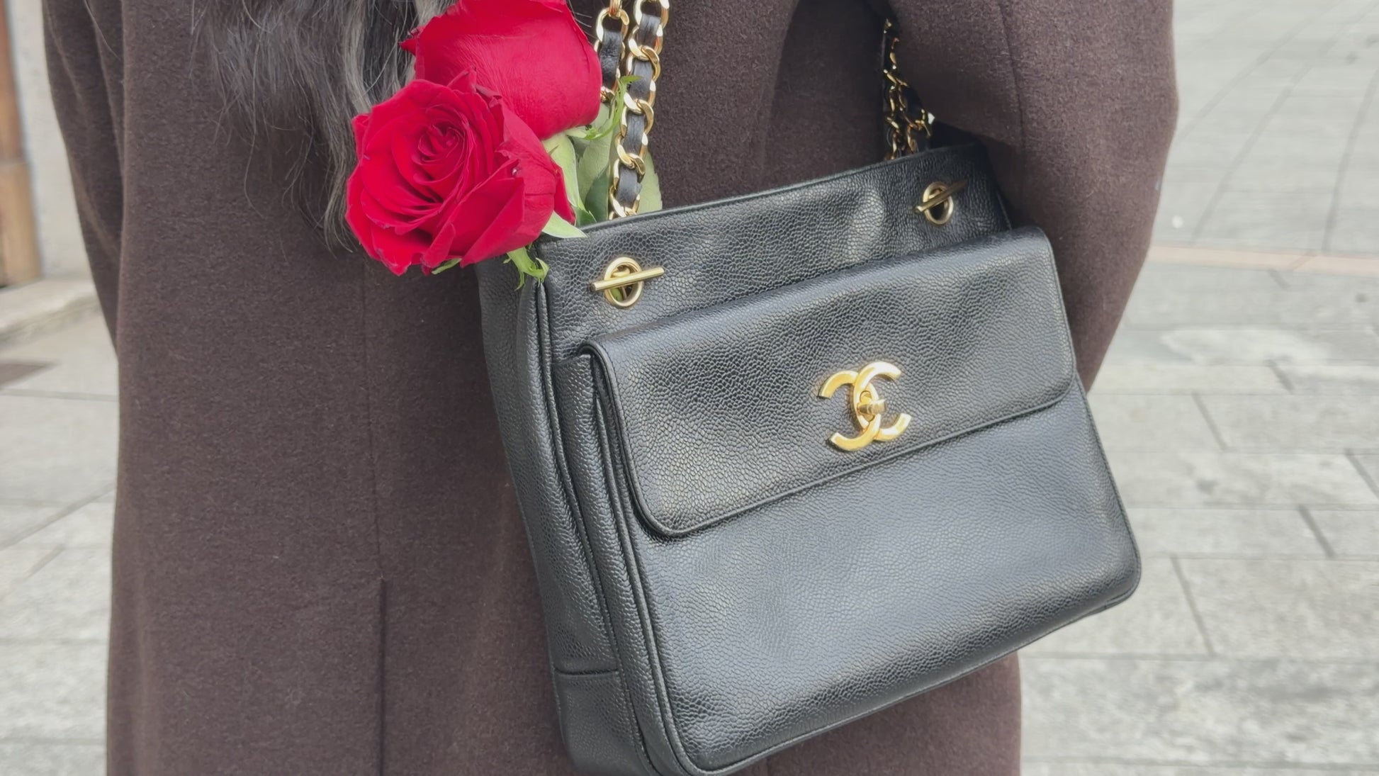 Questa borsa tote Chanel Vintage incarna l'eleganza senza tempo dell'epoca d'oro della Maison. Realizzata in pelle martellata nera e rifinita con finiture placcate oro 18 carati, la borsa riflette la raffinata artigianalità e i codici di design intramontabili che definiscono le creazioni Chanel della metà degli anni '90.