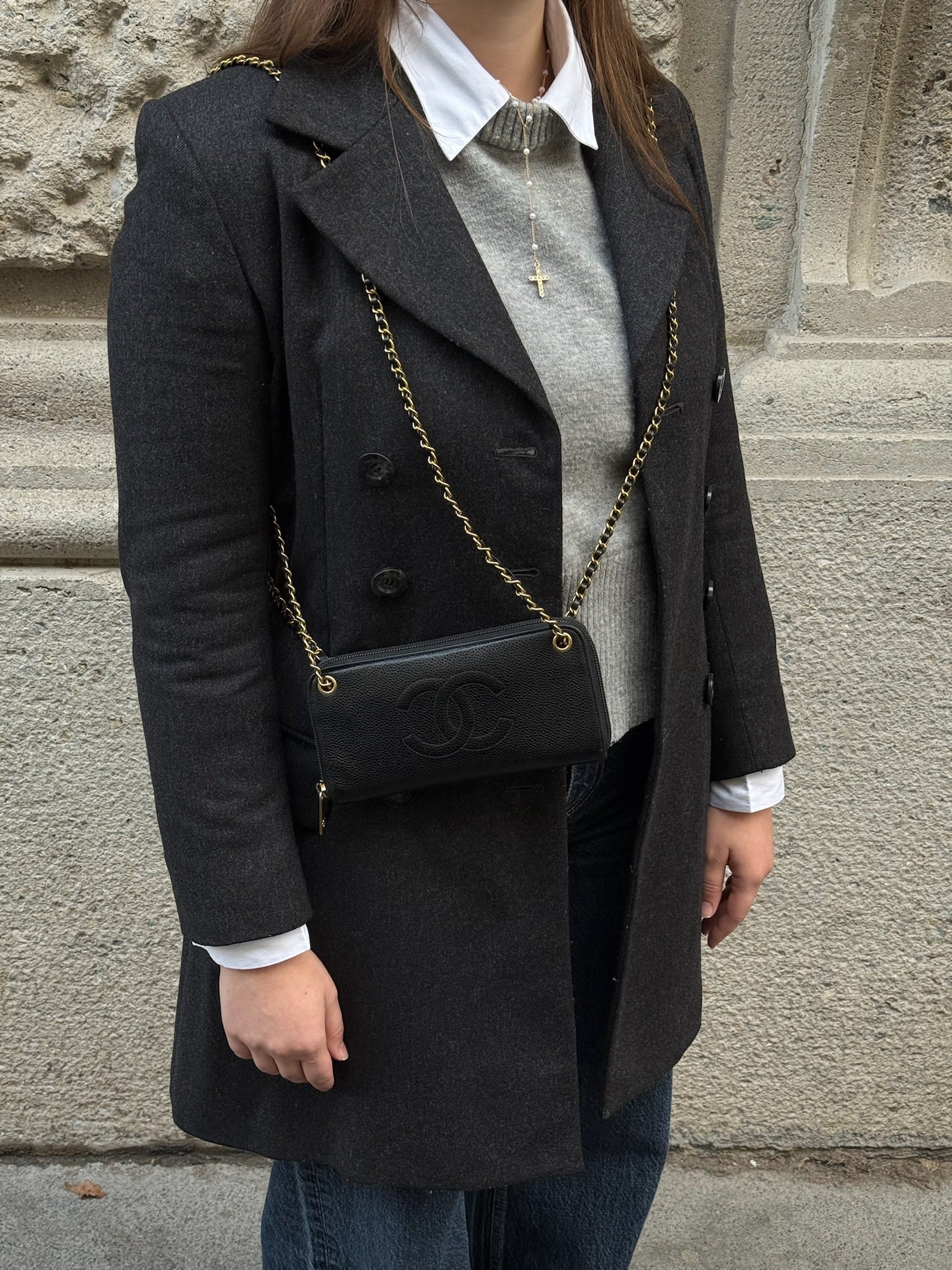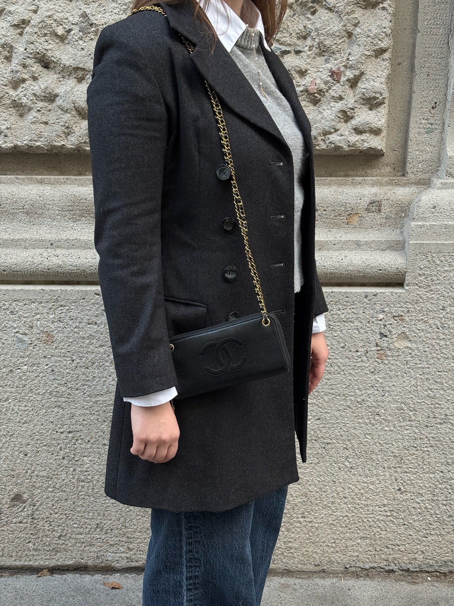 Chanel Re-Worked Zip Vintage Black Interlocking CC Logo Caviar Wallet with Chain