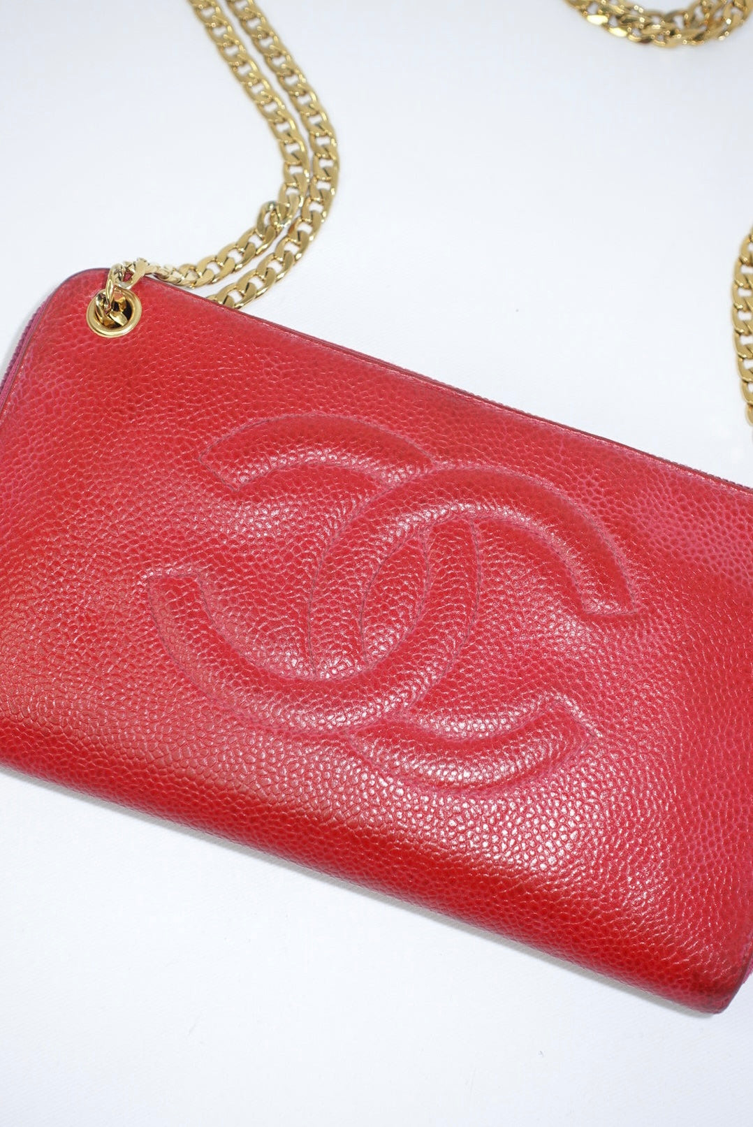 This re-worked Chanel vintage zip wallet with chain in hot pink features the iconic CC logo, offering a bold pop of color with timeless luxury.