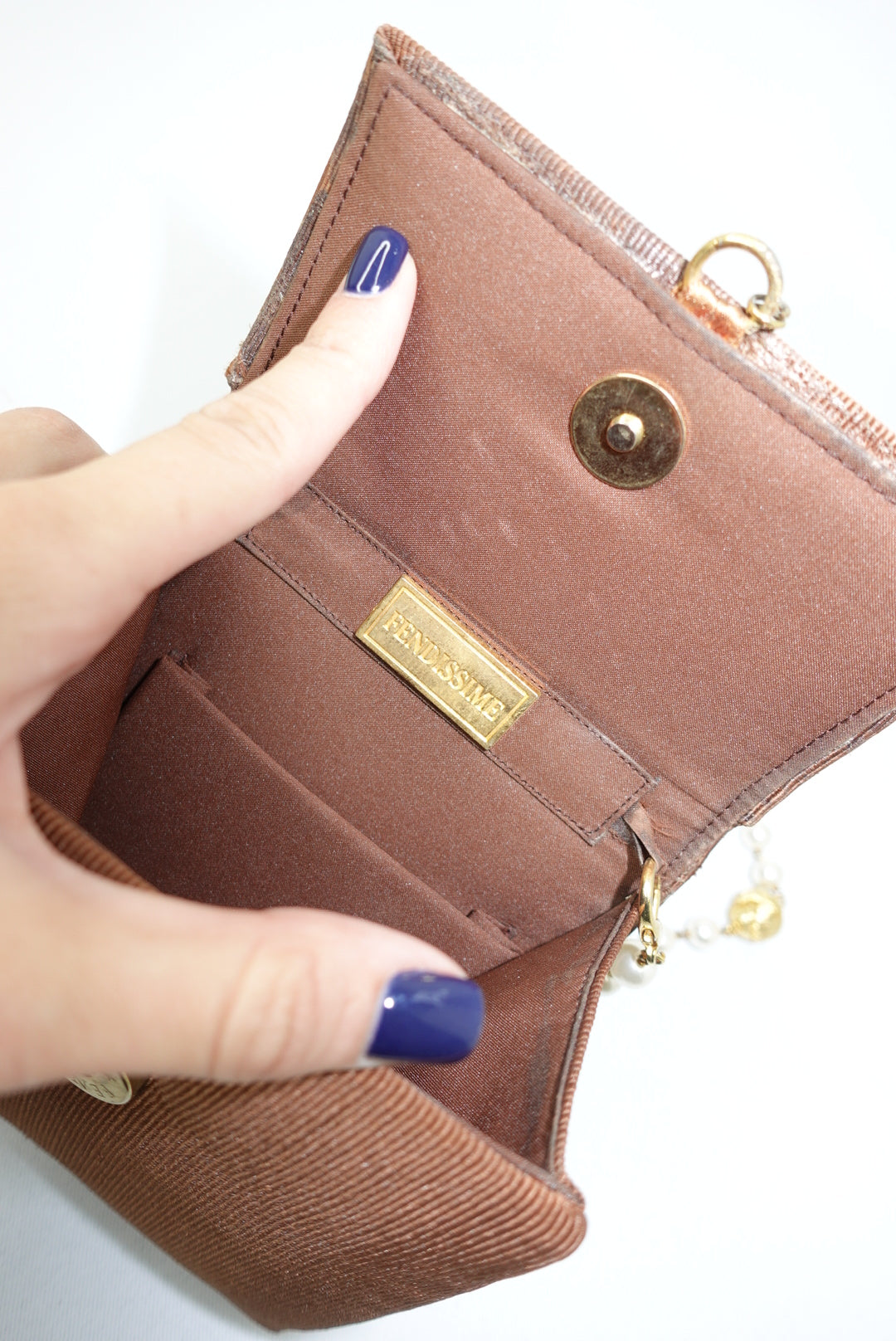 This Fendissime vintage chain bag in caramel tones features gold pearl accents, offering a warm and elegant take on playful luxury design.