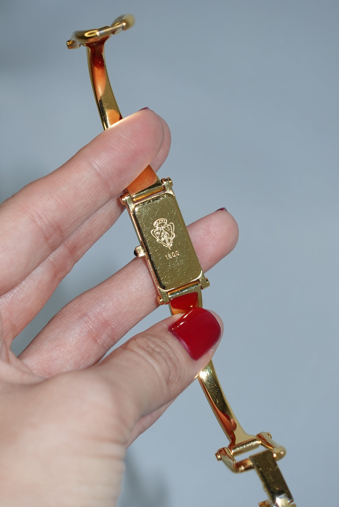 Elegant and unmistakably iconic, this Gucci Vintage 1500L Horsebit Gold Toned Watch reflects the house’s signature equestrian-inspired design. The polished gold-tone stainless steel case frames a crisp white dial, creating a refined and feminine aesthetic.