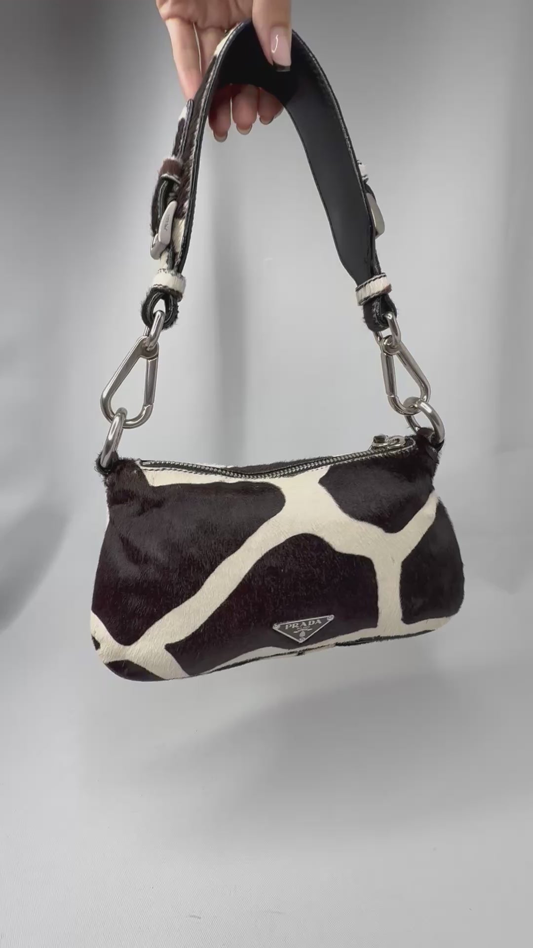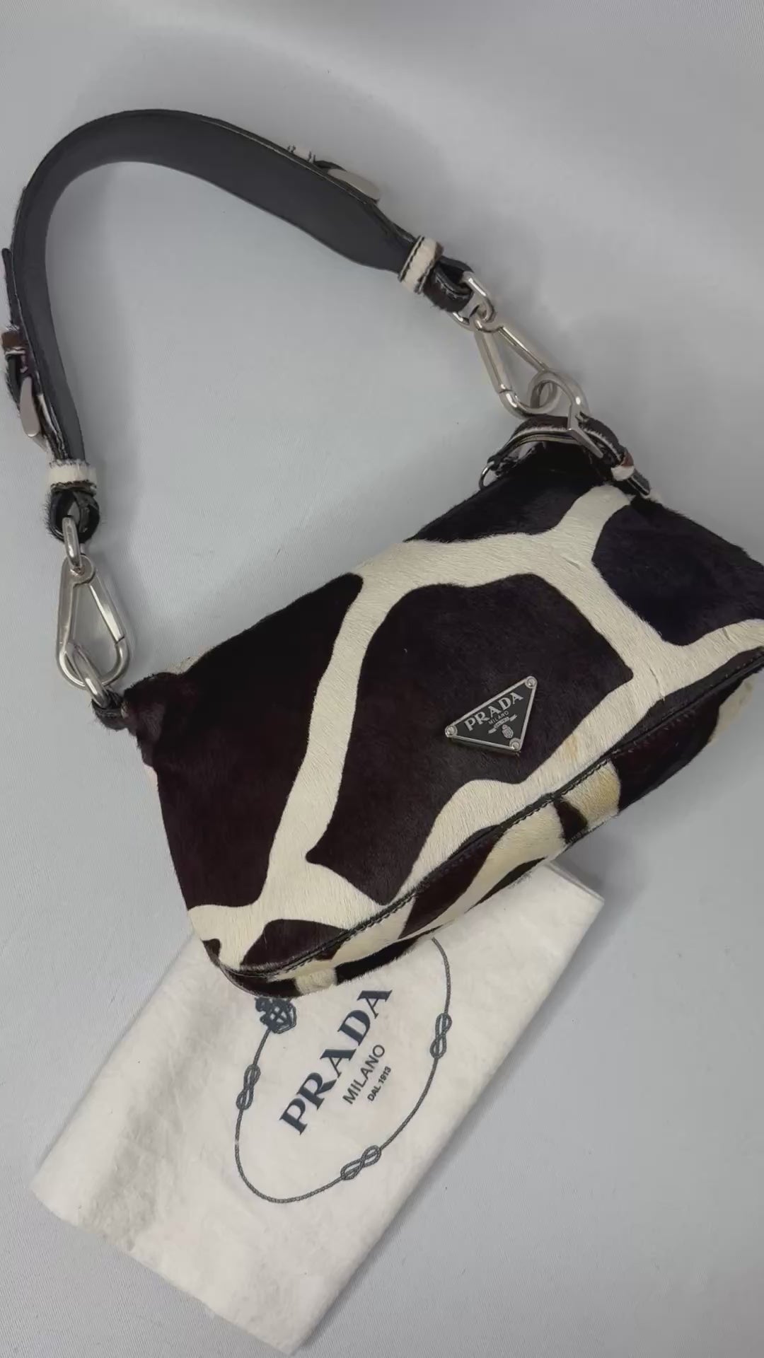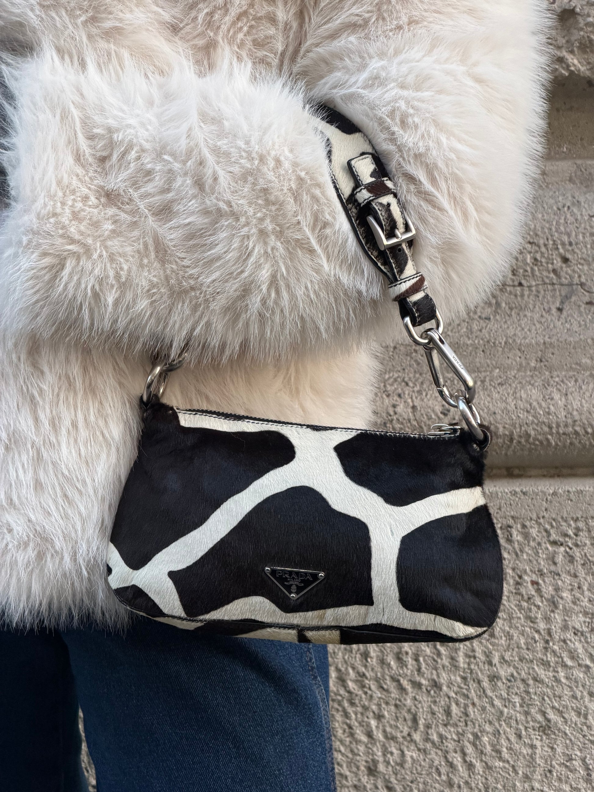 This Prada 2000s vintage shoulder bag in brown pony hair features a rich texture and sleek silhouette, capturing bold Y2K luxury with tactile elegance.