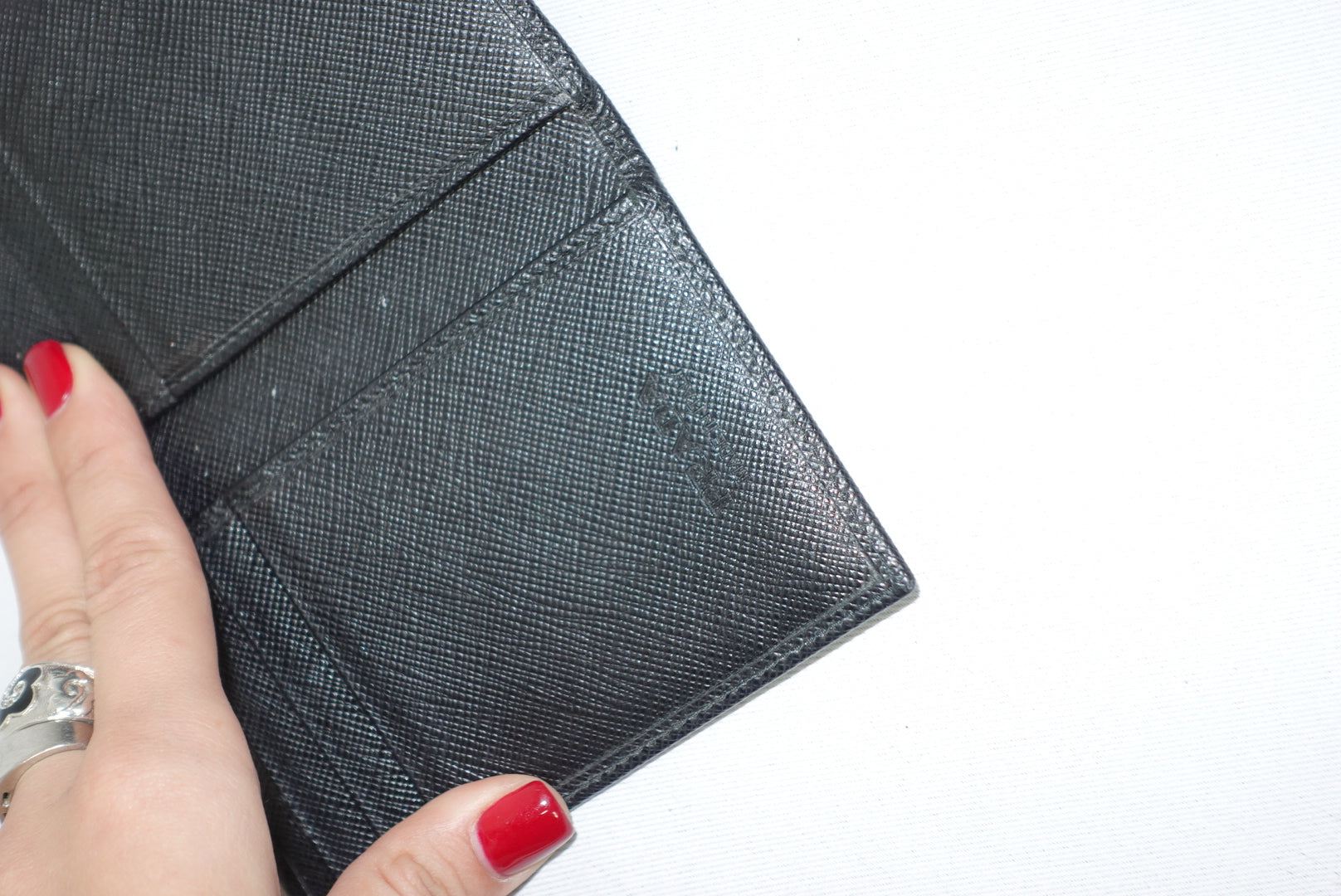 Sleek and sophisticated, this Prada Black Leather Card Holder is crafted from premium black leather and finished with the iconic silver-tone Prada logo. Its slim design keeps your essentials organized while maintaining a refined, minimalist look.